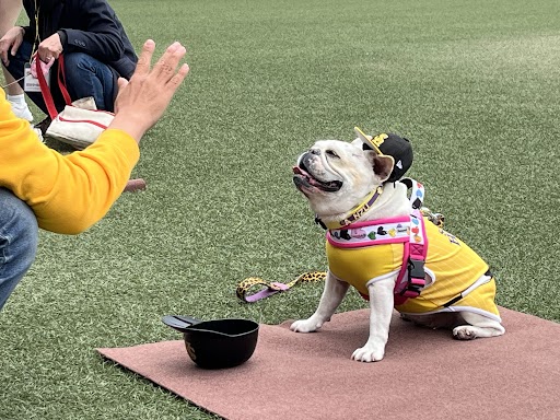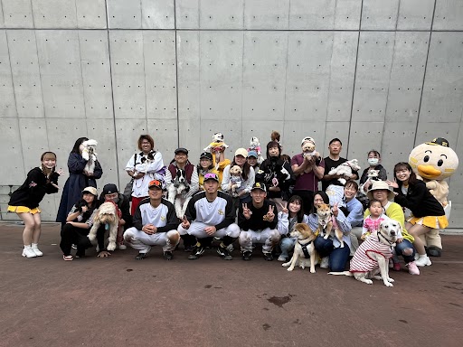 そして、試合前の円陣では三代祥貴選手が、「今日はワンダフルデーということで(←みんなから違う違うと笑われ)、あっ、ワンワンデーということで、球場にワンコちゃんたちがたくさん来ているんですけど、犬のように無邪気に走り回ってどんどん相手をかき乱していきましょう!!」と気合いの入った声出しをしてくれました。この日はファンの皆さんとワンちゃんの声援で5-0と快勝!今回の企画に参加しれくれたファンの方は「いつもは1人で来ているんですけど、一緒に観戦できて楽しかったです♪また来週も来ます!」と嬉しいお言葉をいただきました。ホークスのドッグウェアを着たワンちゃんもたくさん集まってくれて、賑やかな1日でした。今週13日(土)も「ワンワンデー」を開催しますので、愛犬家の方もそうでない方も、タマスタ筑後で若鷹選手への応援よろしくお願いします♪