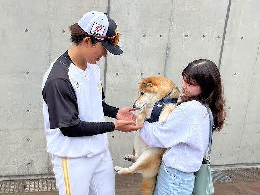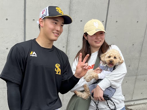 各地で桜の開花・満開の便りが届く心地良い季節になり、お散歩ついでに?!なんとワンちゃんがタマホーム スタジアム筑後にやってきました!!というのも、この日はホークス初のイベント「ワンワンデー」。普段は入ることのできないスタンドで、ご主人様と一緒にワンちゃんも4軍戦を観戦しました。試合前には選手と一緒に写真撮影会を実施。今回参加してくれたのは、加藤晴空選手、佐久間拓斗選手、藤田悠太郎選手。3人とも犬好きということで、撮影の時もワンちゃんとの触れ合いを楽しんでいましたよ。