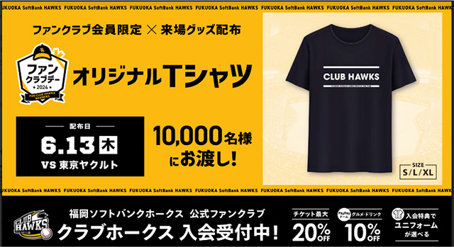 対象試合日に当日の観戦チケットをお持ちのうえ、ご来場のクラブホークス会員に先着で『オリジナルTシャツ』をお渡しします。