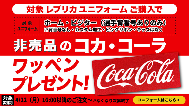 HAWKS公式オンラインストアで、レプリカユニフォームのホームまたはビジターをご購入いただいた方に、コカ・コーラワッペンをプレゼントするキャンペーンを実施中!レプリカユニフォーム1着につき、ワッペン1枚をプレゼントします♪ユニフォームに相性ばっちりのワッペンをぜひゲットしてください!