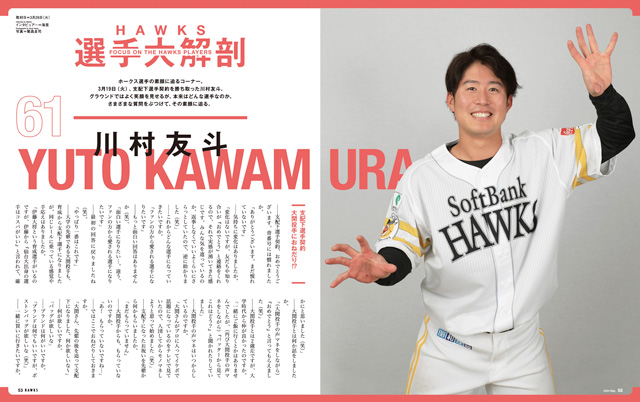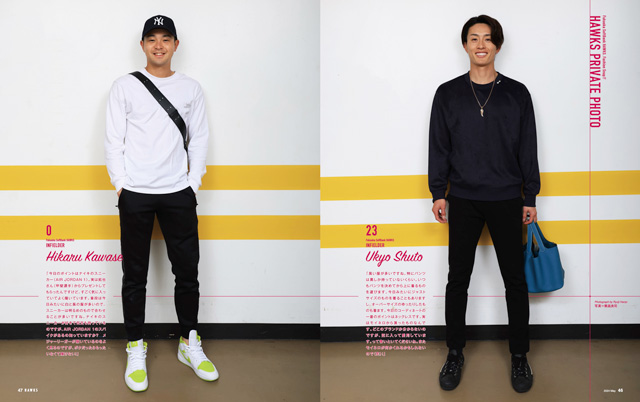 5月号から新コーナーがスタート。選手の私服姿を紹介する「HAWKS PRIVATE PHOTO」。選手の私服姿を撮影し、その日のこだわりポイントを教えてもらいました。第1回目には周東佑京選手と川瀬晃選手が登場してくれました。普段見ることのできないプライベートショットは必見です!