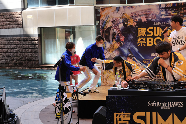 そして、いよいよカウントダウン。「3・2・1、鷹祭 SUMMER BOOST!福岡の夏をブーストしようぜ!」という掛け声とともに、ステージ後方の幕が下ろされ、福岡の街とホークスとの一体感を表現した新ビジュアルがお披露目。それと同時に、DJダイノジが再び登場し、パフォーマンスがスタート。大道芸人YAYAやダンサーたちも登場し、会場は音楽に手拍子やダンスなどで盛り上がりました。