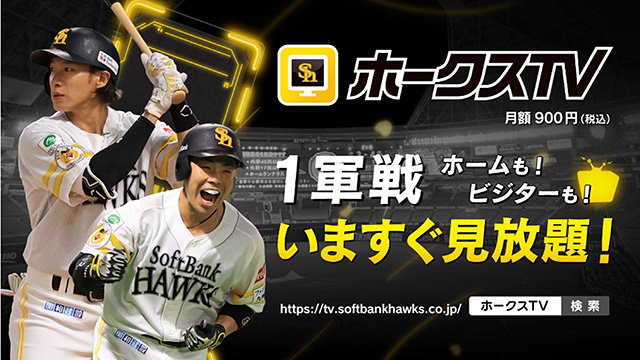 「ホークスTV」は福岡ソフトバンクホークスの公式動画配信サービスです。ホークスTV会員ならパ・リーグ主催全試合が見放題!タマスタ筑後開催の2~4軍戦も全試合ご覧いただけます。さらに、選手の素顔に迫った動画や他球団とのコラボ企画がもりだくさん!月額900円(税込)で1,000本以上の動画コンテンツをお楽しみいただけます。