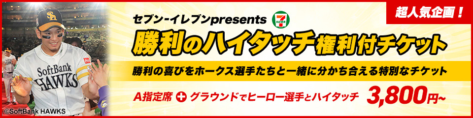 ホークスが勝利すればヒーロー選手とハイタッチできる超人気企画「セブン-イレブンpresents 勝利のハイタッチ権利付チケット」♪各日限定60名、セブン-イレブン・セブンチケット限定での販売となります。ホークス選手と触れ合える、またとないチャンス♬
