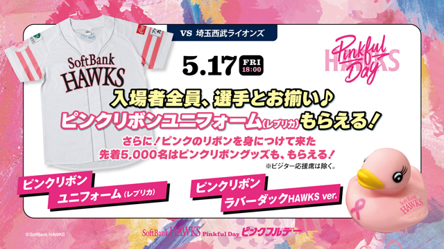 ピンクフルデーの初日、5月17日(金)は、ピンクリボンユニフォーム(レプリカ)を入場者全員に配布するほか、ピンクのリボンを身につけて来場した先着5,000名様へピンクリボンラバーダック HAWKS ver.も配布!試合観戦の記念に、一緒に写真を撮って、ピンクリボン運動を広めよう!また、ビジター応援席へお座りの方へも、ピンクリボンラバーダック Lions ver.を配布します。