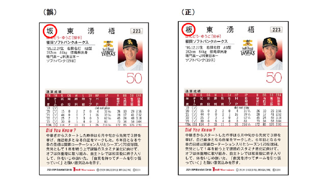「2024BBMベースボールカード1stバージョン」の商品に関しまして、レギュラーカード「No.223 板東湧梧」の裏面の選手名が誤って掲載されていることが判明いたしました。