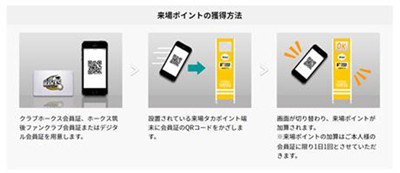 各所に設置している来場ポイント端末に、クラブホークス会員証・筑後ファンクラブ会員証・タカポイントカード・デジタル会員証のいずれかをかざすだけでポイントが獲得できます。