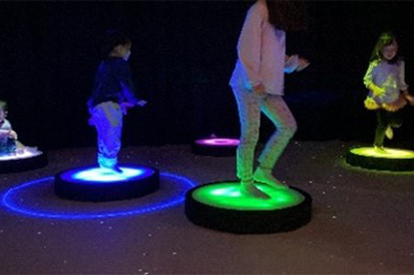 | 福岡在住作家の作品です。ボードに乗ると、光と共に音を奏で、動きに合わせてリズムが変化します。 |