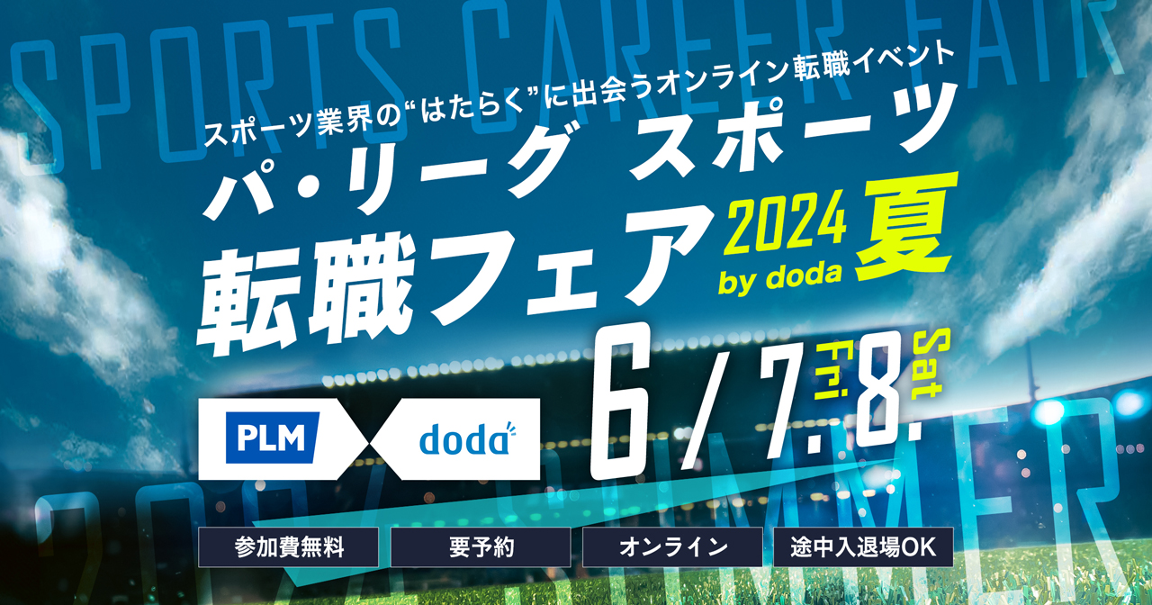 2024年6月7日(金)、6月8日(土)の2日間「パ・リーグ スポーツ転職フェア 2024 夏 by doda」をオンライン上で開催します!本イベントは、パ・リーグ6球団をはじめスポーツ関連企業が一堂に会し、転職を考えるビジネスパーソンの方々にビジネスとしてのスポーツをより知っていただくための中途採用イベントで、パーソルキャリア株式会社が運営する転職サービス「doda」のご協力のもと開催いたします。