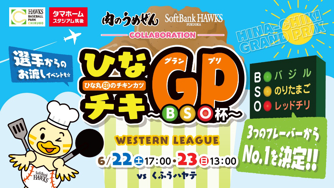 6月22日(土)・23日(日)にタマスタ筑後で開催するウエスタン・リーグ公式戦は、コンコース店舗「肉のうめぜん」のグランドオープンを記念して、「ひな丸印のチキンカツ(ひなチキ)グランプリ~BSO杯~」を開催します。選手からのお渡しイベント(抽選)や限定価格での販売、選手&ファン投票を実施。投票へ参加すると先着でクリアファイルのお渡しも!暑くなる季節にピッタリのグルメや6月のイベント情報もお知らせします。