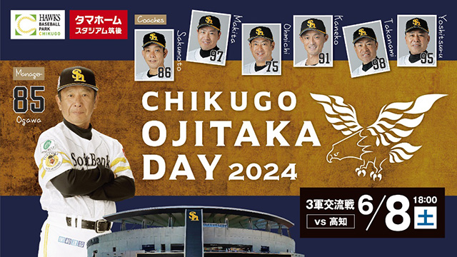 タマスタ筑後で開催する6月8日(土)の3軍交流戦(vs 高知ファイティングドッグス)は筑後おじ鷹デー!3軍首脳陣による「サイン会」や「写真撮影会」を抽選で実施するほか、首脳陣の直筆サイン入りボールが当たる「おじ鷹抽選会」、ビールのハッピーアワーなど、楽しみたくさん♪
