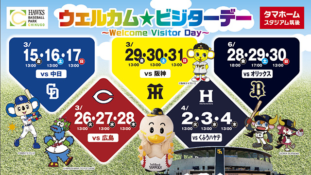開幕からウエスタン・リーグ所属の各球団と実施してきた「ウェルカム☆ビジターデー」もいよいよフィナーレ!6月28日(金)・29日(土)・30日(日)のオリックス戦は、オリックス・バファローズのマスコット:バファローベルがタマスタ筑後に初登場♪ひな丸と一緒に試合を盛り上げます。 各日の入場者先着1,000名へ「マスコットステッカー(オリックス戦Ver.)」の配布やオリックス勝利時もヒーローインタビューを実施するなど、いつもとは一味違った楽しみが満載です☆