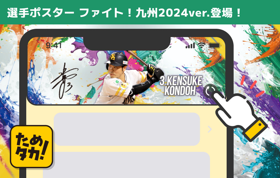 「ためタカ!」アプリの選手ポスター(ホーム画面の着せ替え機能)に、ファイト!九州デザインが登場しました!ホーム画面を好きな選手で着せ替えて、アプリでもファイト!九州を楽しもう♪