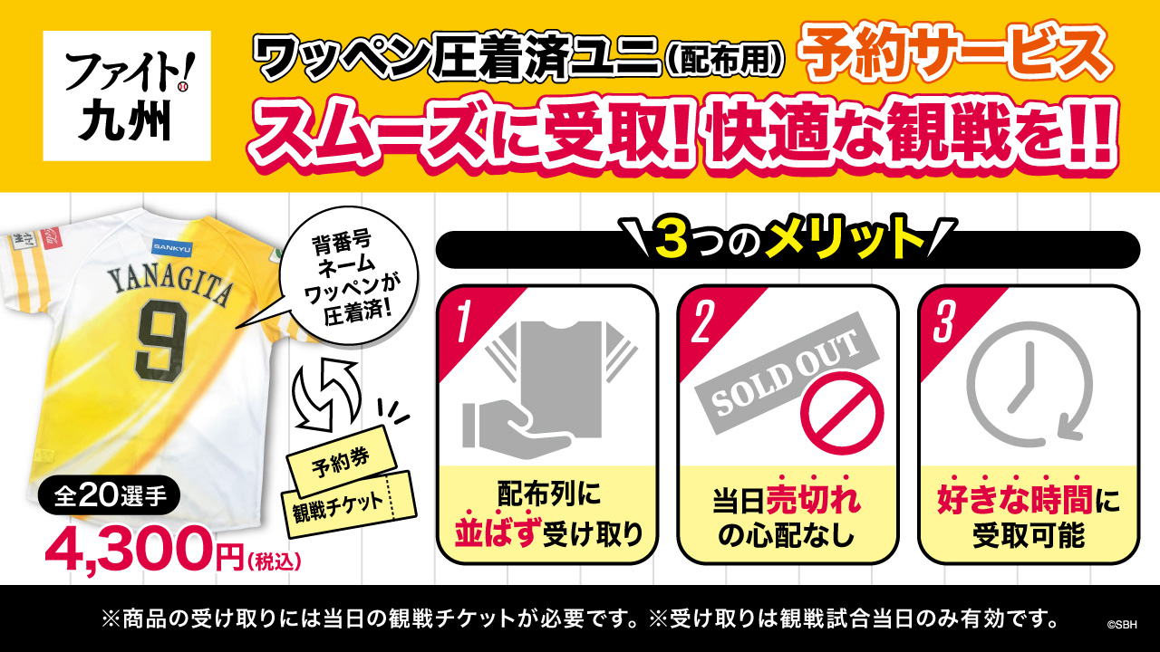 予約券をご利用されるお客様は、対象試合の観戦チケットが必要です。予約券と同日の観戦チケットをお持ちでないお客様には、圧着済ユニフォームをお渡しできません。予約券に記載の試合日と同日の観戦チケットをお持ちでない場合、ワッペン圧着済みユニフォーム(レプリカ)のお渡しはお断りさせていただきます。