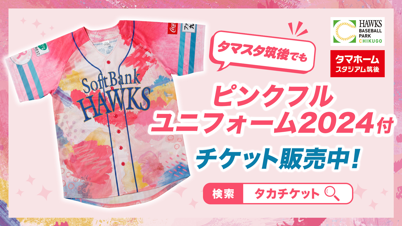 8月試合を対象に「ピンクフルユニフォーム2024」と観戦チケットのセット券をタカチケットとチケットぴあで販売いたします。屋外球場のタマスタ筑後でも映えること間違いなし!