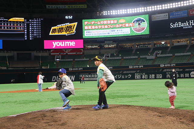 デーゲーム限定でホークスの試合終了後すぐのフィールドを体験!内野エリアではベースランニングやお立ち台での記念撮影、外野エリアではキャッチボールなどをお楽しみいただけます。