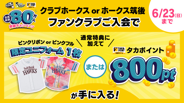 6月23日(日)までのキャンペーン期間中、通常の入会特典の他に、キャンペーン特典として「ピンクリボンユニフォーム(レプリカ)」「ピンクフルユニフォーム2024」「タカポイント800pt」のいずれかがついてきます!ぜひ、この機会に特典満載の「クラブホークス」・「ホークス筑後ファンクラブ」へご入会ください!