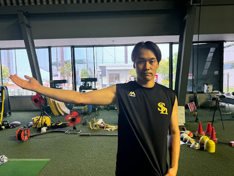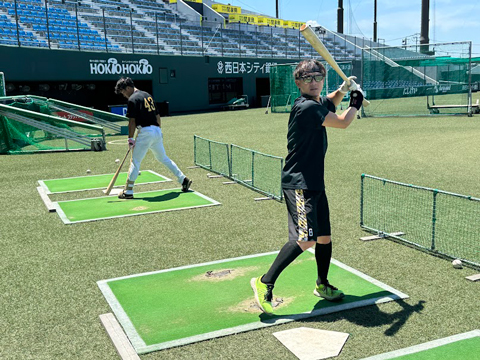このリハビリ組では、現在24名の選手が競技復帰を目指しています。主だった選手の状況としては、4月に右肘のじん帯再建術を受けた武田翔太投手が術後経過は良好で今は肘の可動域を広げようとしている状態。まだ投手としての復帰プログラムにも入っておらず復帰まで1年以上はかかる見込みですが、本来の性格もあって明るく前向きに過ごしています。右わき腹を痛めていた牧原大成選手の復帰はもうすぐ。現在はリハビリの最終段階に入っていて、打撃練習や守備練習も再開しているので、あとは日々のコンディションを見ながらいつ試合に入っていくか…という判断をする状況です。