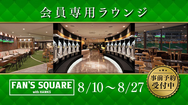タカポイントでは、8月10日(土)~27日(火)にみずほPayPayドームで開催する試合における会員専用ラウンジ「FAN’S SQUARE」事前予約の抽選受付を開始します。試合開始前のご利用は事前予約(抽選)制です。当日の観戦チケットをお持ちのダイヤモンド・プラチナステージ会員様のみお申し込みいただけます。