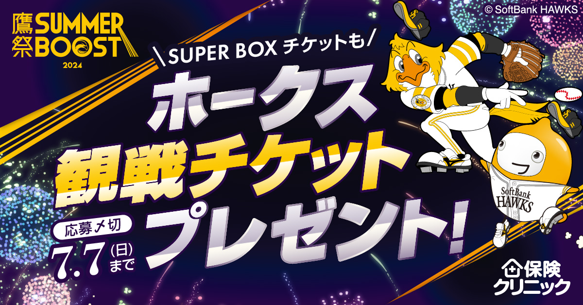 全国270店舗以上を展開する来店型保険ショップ『保険クリニック』は、7月と8月にみずほPayPayドームで開催する「鷹祭 SUMMER BOOST」への協賛が決定しました!これを記念して、プレゼントキャンペーンを実施します!クイズに正解した方の中から抽選で鷹祭 SUMMER BOOSTの指定席引換券や専用ユニフォームなどを合計で310名様にプレゼント☆みなさまからのご応募、お待ちしています!