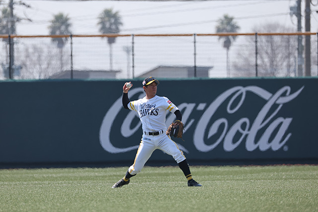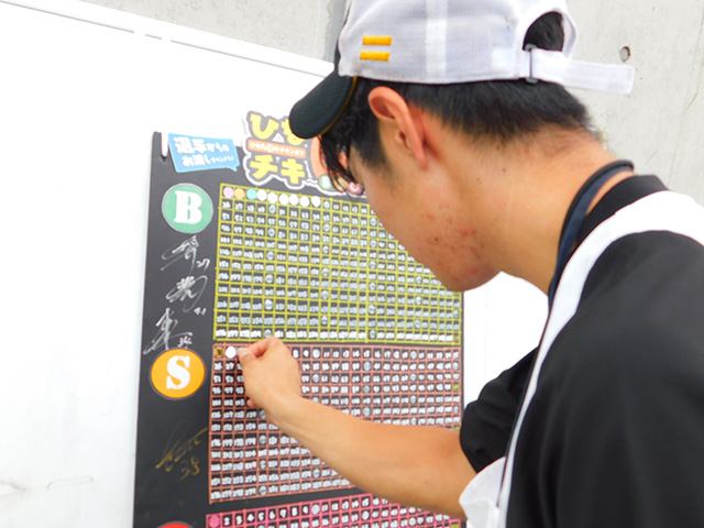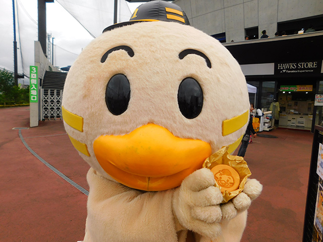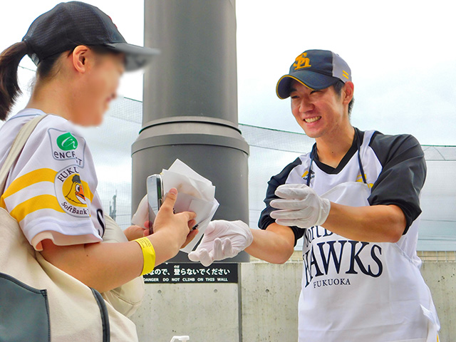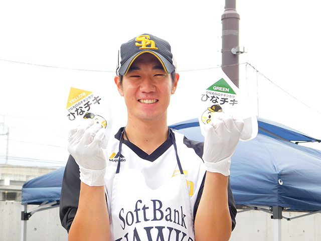 皆さん、タマスタ筑後の新名物「ひなチキ」をご存じですか?コンコース店舗「肉のうめぜん」で6月22日(土)からタマスタ筑後コラボメニューとして販売されているチキンカツで、バジル風味、のりたまご風味、レッドチリ風味といった3種のフレーバーを楽しめます。販売初日には「ひなチキGP~BSO杯~」のお渡しイベントに勝連大稀選手が参加。3種のフレーバーを試食した勝連選手は「チキンも柔らかくどのフレーバーも美味しかった」と大満足。そして自身の好きなフレーバーとしてのりたまご風味に一票!慣れ親しんだ味がベストマッチだったようで「のりたまご風味は誰でも好きな味だと思います。でも、どれもおススメなので3つ買っちゃってください!」ということでした(笑)。そんな勝連選手は、沖縄県出身の23歳。育成ドラフト4巡目で入団して今年で5年目です。今シーズンへの思いを聞くと、「もともと守備には自信があったのですが、最近は打撃の方も自信が出てきて楽しく野球ができています。今年は育成5年目なので、勝負の年だと思っています。これまでずっと2軍に帯同させてもらっているのですが、できることは全部やって悔いのないようにしたいです」と、ほんわかした雰囲気の中にも今年にかける強い思いを感じました。支配下登録期限まで残すところ約1ヶ月。がむしゃらにがんばっている姿をぜひ球場で応援してください!