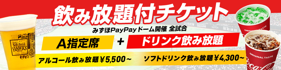 ホークスの熱い戦いを肴に、お好みのドリンクを流し込む至福の時間を心ゆくまで楽しんでいただける「飲み放題付チケット」。お酒を飲まない方はソフトドリンク飲み放題を選べるのもうれしいポイント。スタジアム観戦ならではの臨場感を満喫してください。