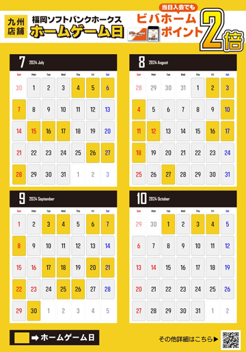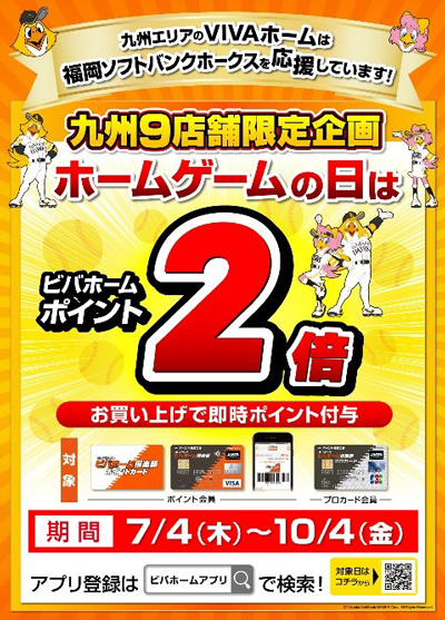 期間中のホークスホームゲーム開催日に九州エリアのビバホーム店舗で商品をご購入いただくと、ビバホーム倶楽部会員様はもれなくご購入時にもらえるポイントが2倍となります!