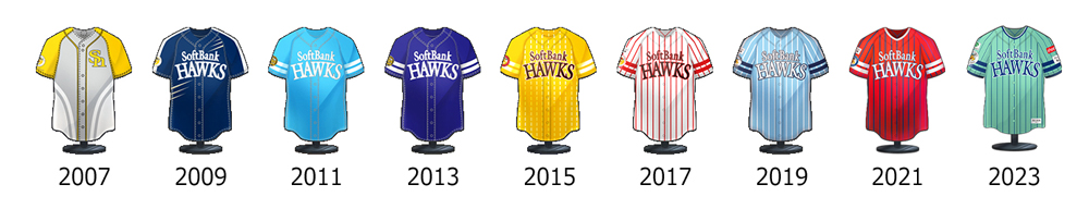 歴代ユニフォームのうち、奇数年のユニフォーム(2007、2009、2011、2013、2015、2017、2019、2021、2023)