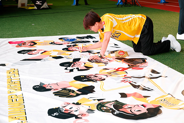 最後に、鷹祭 SUMMER BOOSTモザイクアートを紹介。りおたさんデザインの巨大アートに、ホークスファンや福岡の街の皆さんのメッセージを集めて作り上げていきます。そのスタートとしてりおたさん自らその場でサインと小久保監督の似顔絵を描いていただきました。りおたさんは「これから約1ヶ月間イラストで福岡の街を彩ることができれば」と描き上げたイラストへの思いを語りました。その後皆さんに「福岡の良いところ」をテーマにメッセージを書いてもらいアートの作成が進みました。