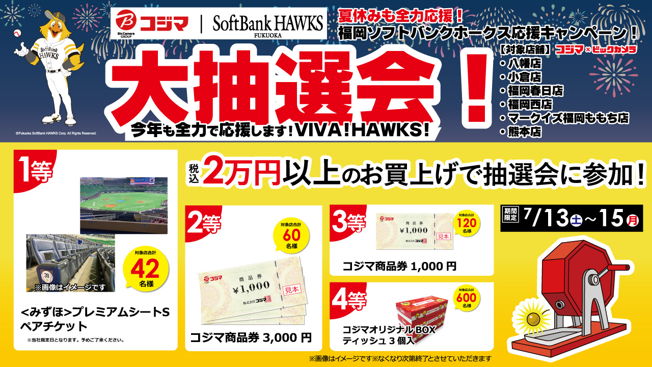 株式会社コジマは、7月13日(土)~7月15日(月・祝)の3日間、「福岡ソフトバンクホークス」の更なる活躍を願い、観戦チケット<みずほ>プレミアムシートSやコジマ商品券等が合計822名様に当たる「コジマのホークス応援キャンペーン」を福岡県内店舗・熊本県内店舗(計6店舗)にて実施します!
