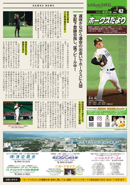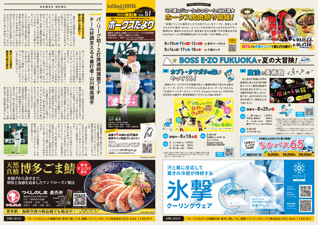 福岡市・糸島市、筑後市・久留米市・大牟田市と福岡ソフトバンクホークスの包括連携協定事業の一環として、『ホークスだより』を発行しています。7月号の福岡市・糸島市版は山川穂高選手、筑後市・久留米市・大牟田市版は前田純投手を特集した内容でお届けします。