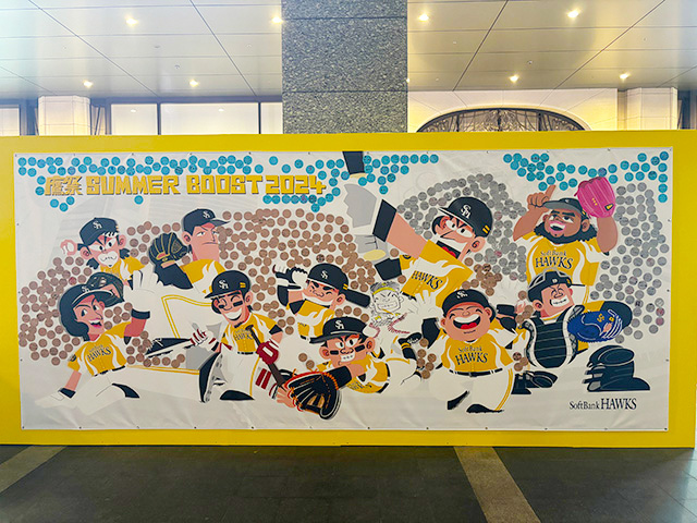 さらに、みんなで作る巨大メッセージアートも設置!スポーツイラストレーター「りおた」さんが描いた選手イラストの背景に、ホークスファンや福岡の街の皆さんのメッセージを集めて作り上げていきます。メッセージのテーマは「福岡の好きなところ」。1日だけでもたくさんのメッセージが集まりました。完成した作品はみずほPayPayドームに展示予定ですので、お楽しみに。