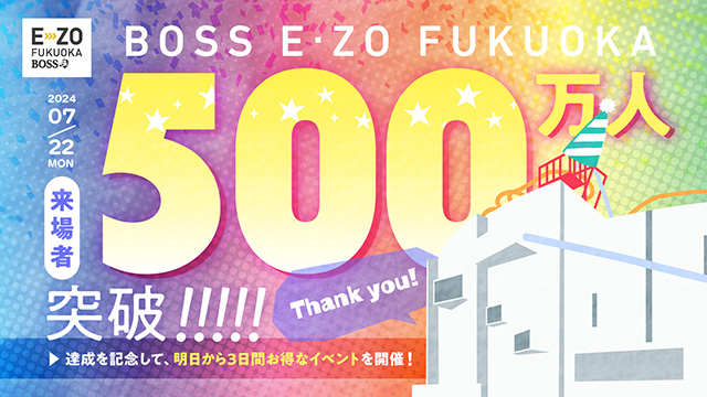 BOSS E・ZO FUKUOKAは、2020年7月に開業し7月22日(月)に累計来場者数が500万人を突破しました!記念すべき500万人のご来場者は筑紫野市からお越しの吉良悠聖(きらゆうと)様とご家族の皆さん。「みずほPayPayドームには何度か来たことがありますが、BOSS E・ZO FUKUOKAは初めてです!4F王貞治ベースボール内にある89パークの『ホークスDASH』を楽しみにきました。嬉しかったです。」とコメントを頂きました。