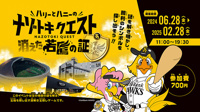 E・ZOとみずほPayPayドームを舞台とした謎解きイベント「ハリーとハニーのナゾトキクエスト 消えた若鷹の証」が特別価格500円(通常700円)!消えた若鷹の証をめぐる謎解きにチャレンジしよう!