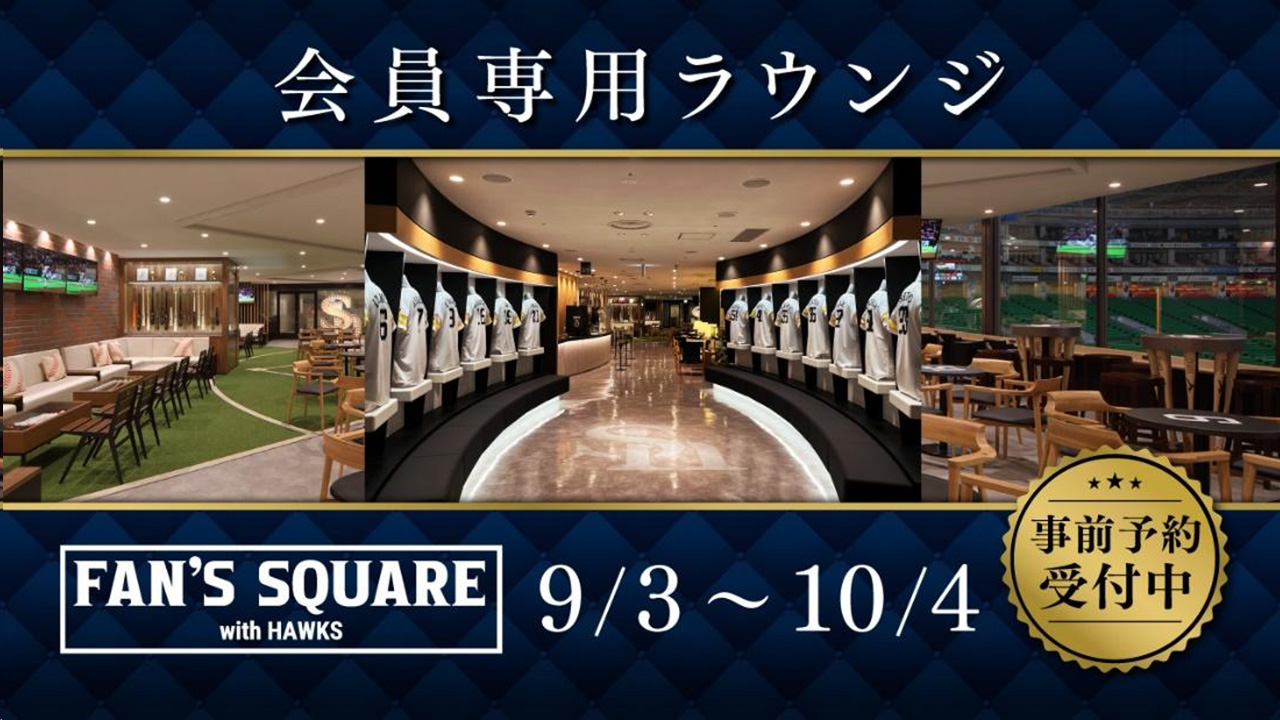 タカポイントでは、9月3日(火)~10月4日(金)にみずほPayPayドームで開催する試合における会員専用ラウンジ「FAN’S SQUARE」事前予約の抽選受付を開始します。試合開始前のご利用は事前予約(抽選)制です。当日の観戦チケットをお持ちのダイヤモンド・プラチナステージ会員様のみお申し込みいただけます。