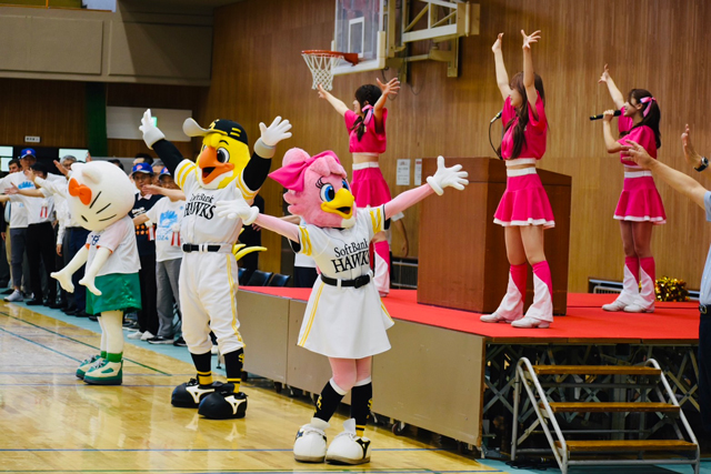 開会式では大会オリジナルTシャツ、帽子を着用した王会長があいさつ。「子どもたちの目の輝きと笑顔が活力を与えてくれます。暑さに負けないで頑張ってください。頑張って!」と力強いガッツポーズをつくって激励しました。ホークスの公式ダンスチーム「ハニーズ」のメンバーは子どもたちに簡単な振り付けを指導し、ホークスのマスコットキャラクター「ハリーホーク」「ハニーホーク」らとともに、球団歌の「いざゆけ若鷹軍団」のサビ部分を元気よく踊りました。