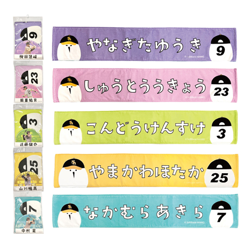今回は選手のラインナップも増え、柳田選手、周東選手、近藤選手、山川選手、中村晃選手デザインのたまごあしも…!?子どもから大人まで、年齢問わず使える名前入りタオルは試合観戦時の応援にぴったり!