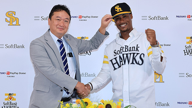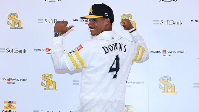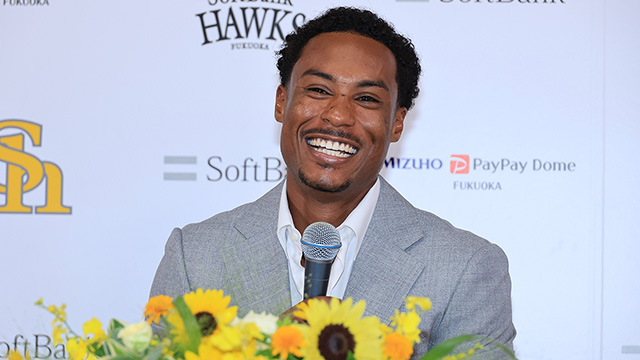 8月18日(日)、ジーター・ダウンズ選手(背番号4)の入団会見がみずほPayPayドームで行われました。ダウンズ選手はコロンビア出身の26歳。遊撃手をはじめ、三塁手、二塁手をこなすユーティリティープレイヤーです。