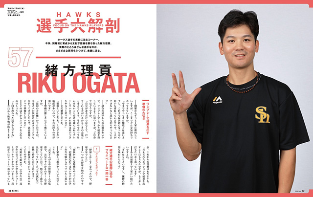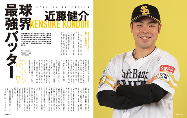 巻頭特集では、近藤健介選手にインタビューを行いました。今や球界ナンバーワンのバットマンと言っても過言ではない近藤選手。今シーズンは5番に座り、チャンスでは打点を挙げ、ランナーがいない場面ではしっかりチャンスメークとケースバッティングができる欠かせない存在です。ホークス内でもいろいろな選手が教えを乞うほどのバットマン。そんな近藤選手にバッティング理論について語ってもらいました。