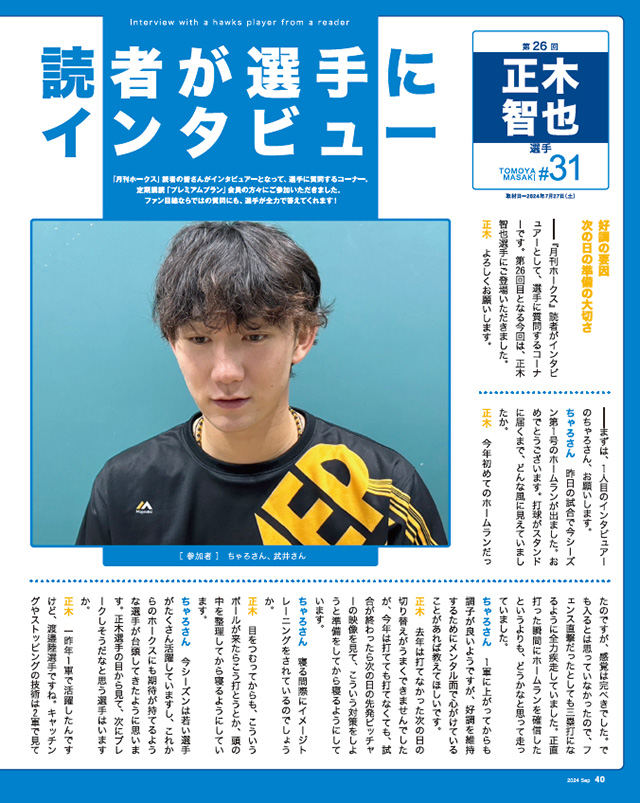 月刊ホークス定期購読プレミアムプランにご加入の読者がインタビュアーとして選手に質問する「読者が選手にインタビュー」。今回は正木智也選手に登場してもらいました。ファンの方からの質問に、全力で答えてくれています!