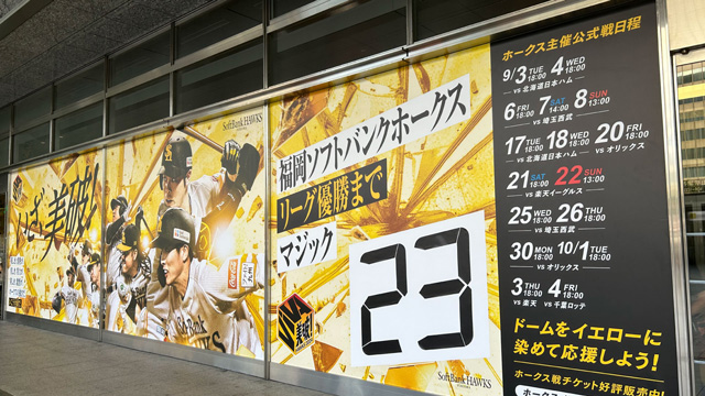 福岡の街中・地下鉄各駅に選手ビジュアルを掲出するほか、JR博多駅ではリーグ優勝マジックカウントダウンがスタート!4年ぶりのリーグ優勝・日本一へ、みんなの想いをひとつに!ホークスへの応援をお願いいたします!