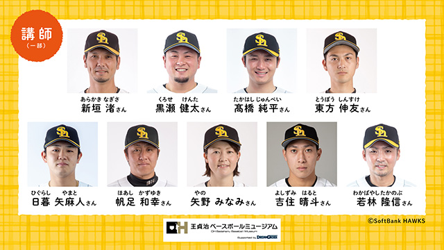 土日祝日は元プロ野球選手に会える!総勢9名のコーチが「王貞治ベースボールミュージアム Supported by DREAM ORDER」で指導します!野球経験者への本格的な指導から、野球初心者へは遊び感覚の指導など、お子さまのレベルに合わせて野球体験をお楽しみいただけます。日頃から疑問に思っていることやわからないことなどをコーチに聞ける絶好のチャンス!ぜひお越しください♪