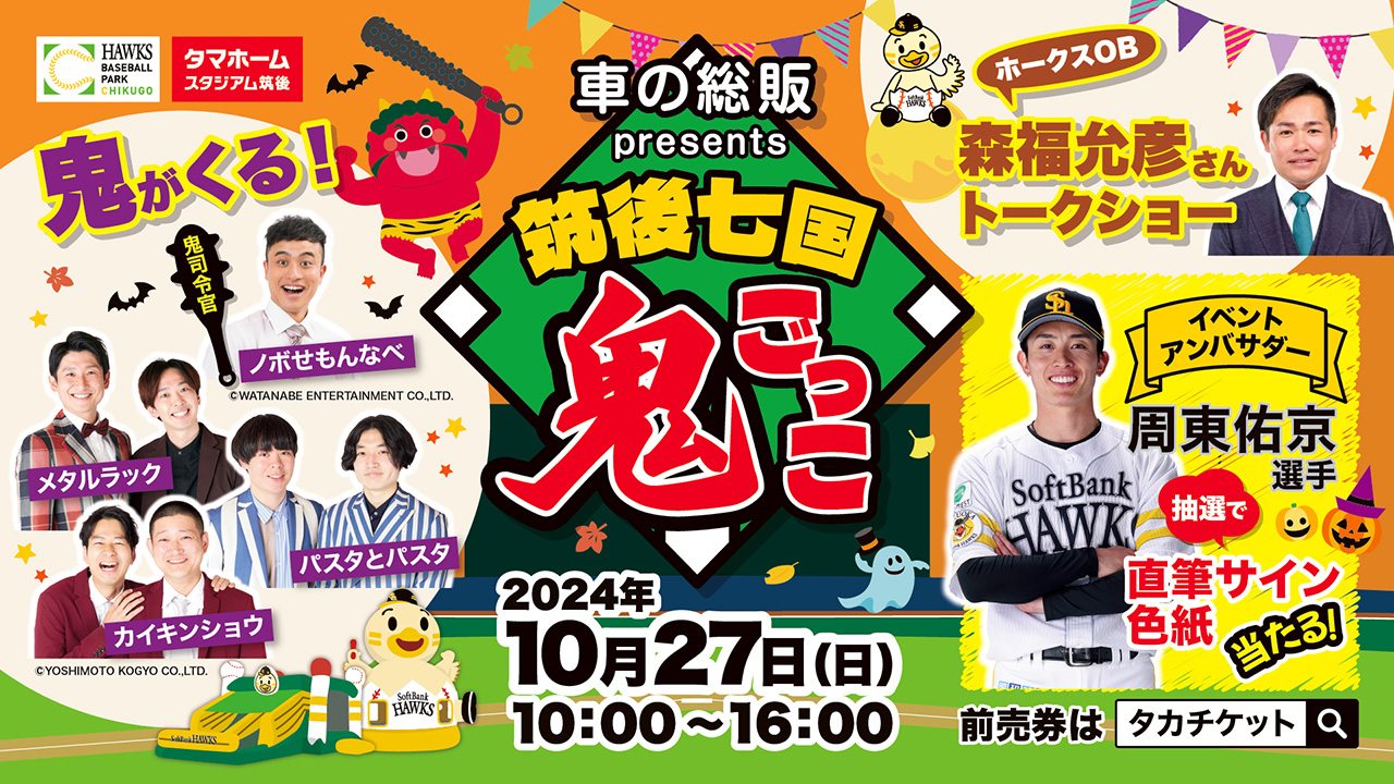 「ノボせもんなべ」や吉本芸人から陸上・ラグビーなどの現役スポーツ選手まで、“走力と体力”に自信がある鬼ゲストを迎えて、タマスタ筑後のグラウンドを舞台に「鬼ごっこ」を開催!迫ってくる鬼から逃げ切ると、景品がグレードアップします♪