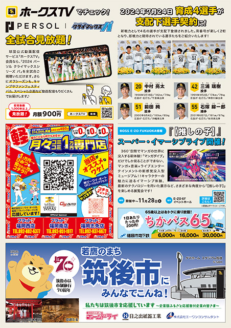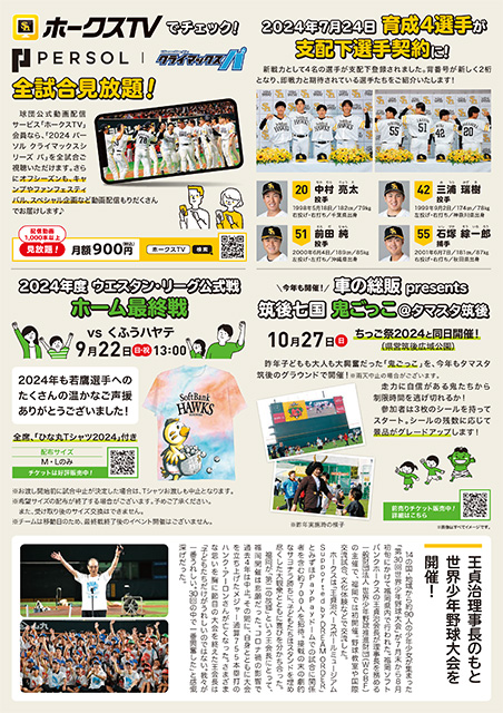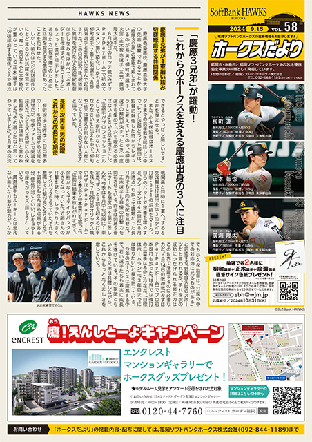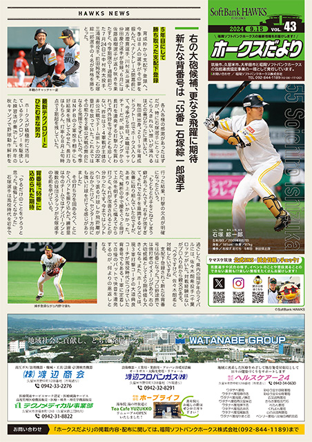 福岡市・糸島市、筑後市・久留米市・大牟田市と福岡ソフトバンクホークスの包括連携協定事業の一環として、『ホークスだより』を発行しています。9月号の福岡市・糸島市版は柳町達選手・正木智也選手・廣瀬隆太選手、筑後市・久留米市・大牟田市版は石塚綜一郎選手を特集した内容でお届けします。