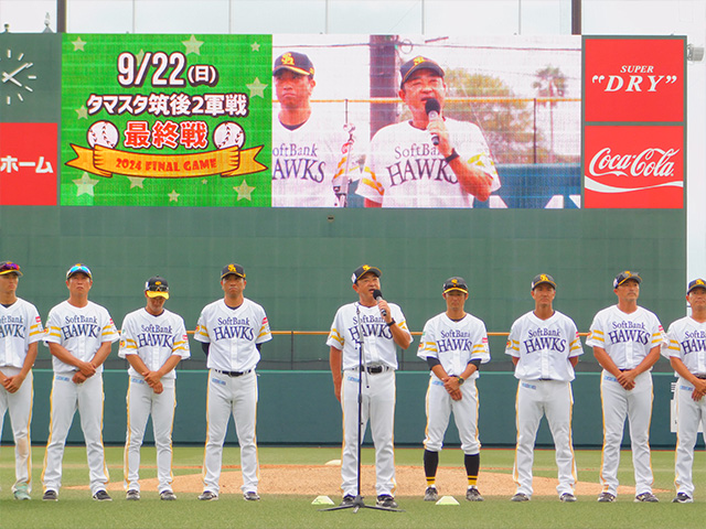 試合終了後にはホーム最終戦セレモニーが行われ、松山秀明2軍監督が「1年間、筑後での応援本当にありがとうございました。あと6試合、試合が残っています。2軍の方も優勝できるように全力で頑張ってきます。この筑後の方から熱い応援をお送りください。どうかよろしくお願いします」と1年間の感謝と引き続きの後押しのお願いを言葉にしました。