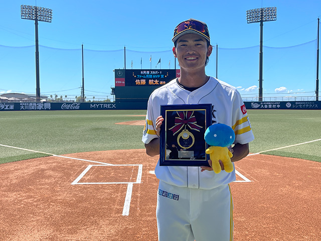 昨季ウエスタン・リーグ優勝を経験した笹川吉康選手は「残り試合、もう勝つことしか考えてないです。優勝するしかないです!」と強い意気込みを語ってくれました。また今季3軍所属ながら2軍の試合に参加し目覚ましい活躍を見せている佐藤航太選手は「目の前の1試合1試合、自分のやるべきことをやって、チームに貢献できるように最後まで頑張ります」と話しました。ちなみに、18日(水)に8月度「スカパー!ファーム月間MVP賞」の表彰式が行われたのですが、記念品に自分の名前が刻まれているのを見て、やっと受賞の実感が沸いてきたそうです。日々貪欲に練習に励んでいる姿を見ると、さらなる活躍に期待がかかります!