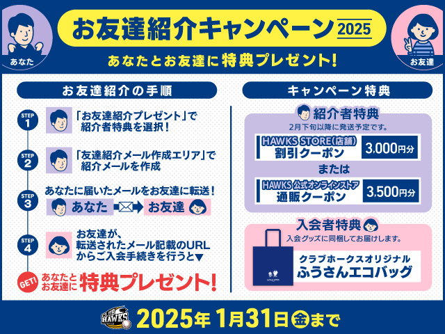2025年1月31日(金)までに、クラブホークスにお友達をご紹介いただいた方と紹介にて入会いただいたお友達にプレゼントを差し上げます!