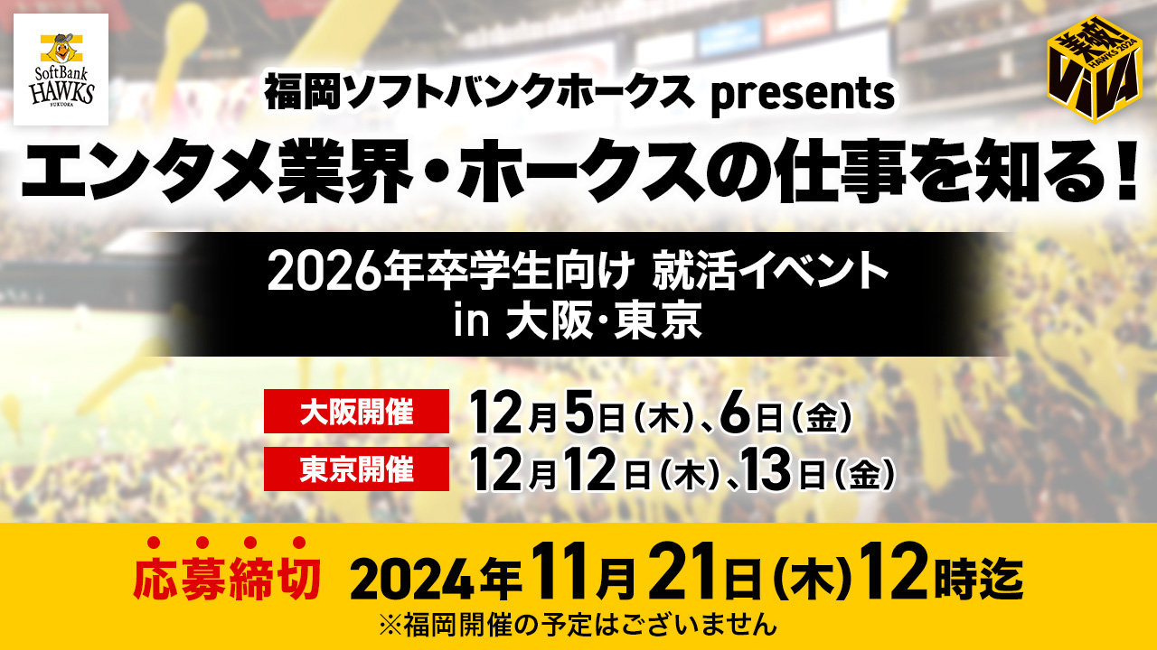福岡ソフトバンクホークス株式会社では、2026年度新卒採用に向けて大阪・東京で12月に対面での新卒採用イベントを開催します。会社説明会や先輩社員座談会、グループワークやレゼンテーションなど、ご希望のプログラムにエントリーしてください。スポーツビジネス・エンターテインメントビジネスに関心のある、熱い気持ちを持った学生のみなさまのご応募をお待ちしております!※福岡での開催はございませんので予めご了承ください。