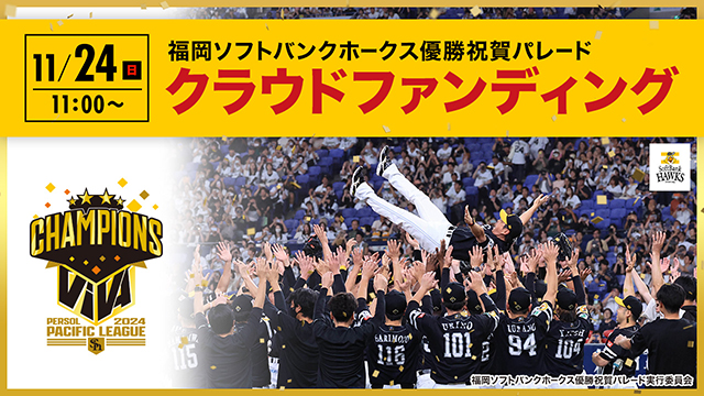 福岡ソフトバンクホークス優勝祝賀パレードについて、交通誘導や安全管理など皆様に安心してお楽しみいただくための事業費を募るクラウドファンディングサイトが、福岡ソフトバンクホークス優勝祝賀パレード実行委員会によって立ち上げられました。皆様のご理解とご協力を何卒よろしくお願い申し上げます。