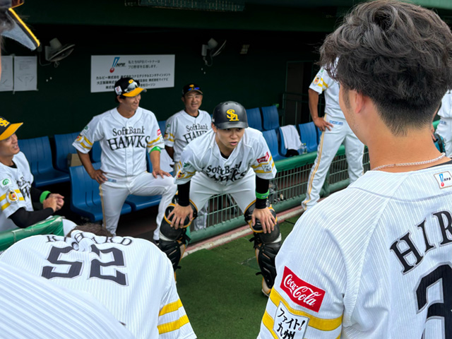 試合前の円陣では、みんなに「キャプテン!」と声出しを促された谷川原健太選手が「今チームがここにいるのは僕が導いたおかげです!チャンスをくれたら1発で還すんで!」と笑いを取りつつも頼もしい言葉でチームを鼓舞しました。ホークス先発投手はウエスタン・リーグで10勝をあげ最多勝利投手賞を獲得した前田純投手。「よっしゃ来た、という気持ち。やるからには1位を」と意気込んで臨んだマウンドでした。
